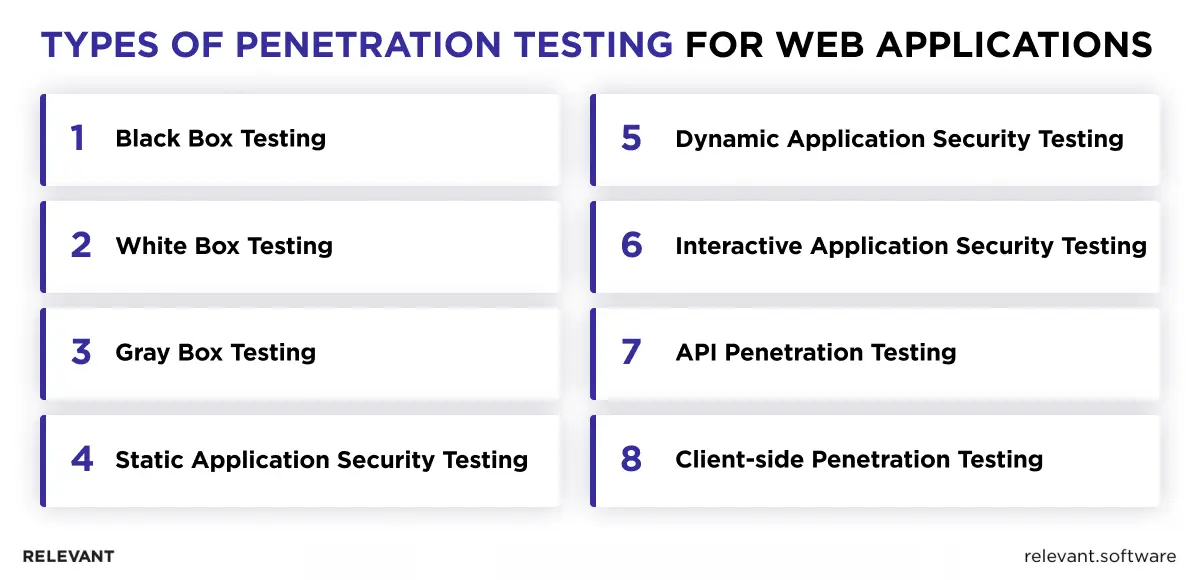 Penetration testing for web applications spans several distinct methods, each targeting a specific security layer. Together, these types of penetration testing reveal weaknesses that attackers could exploit in 2025’s threat landscape.